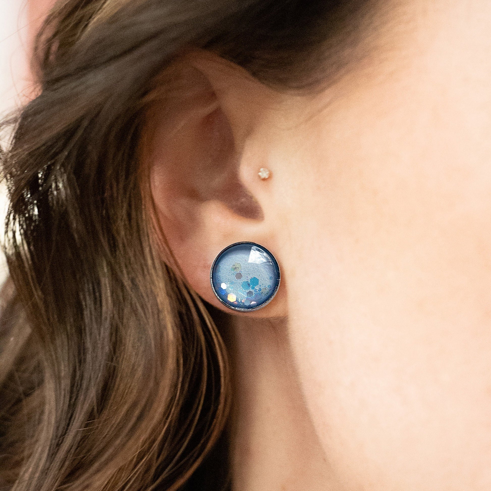 Stand out with these one-of-a-kind cabochon earrings. Each earring is 12mm and handmade with stainless steel, glass, and glitter for an extra sparkle. Choose from a variety of finishes including silver, gold, rose, black, or rainbow for the findings to make your look unique. Due to the nature of the handmade process, each pair is unique and may have slight variations in pattern from what is shown here. These earrings are perfect for everyday wear or a special occasion - so go ahead and treat yourself!