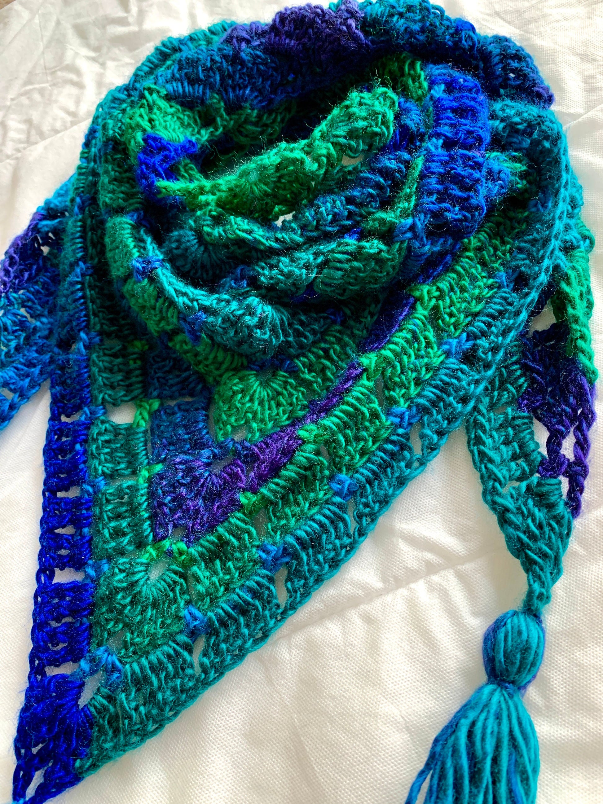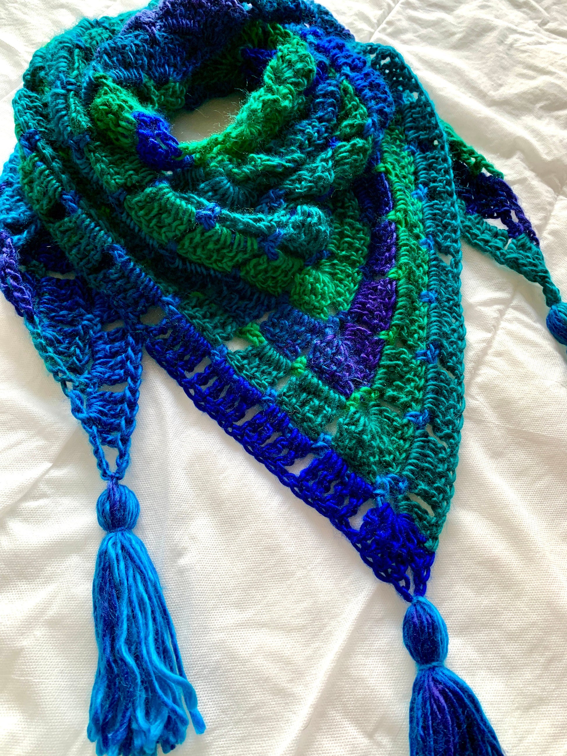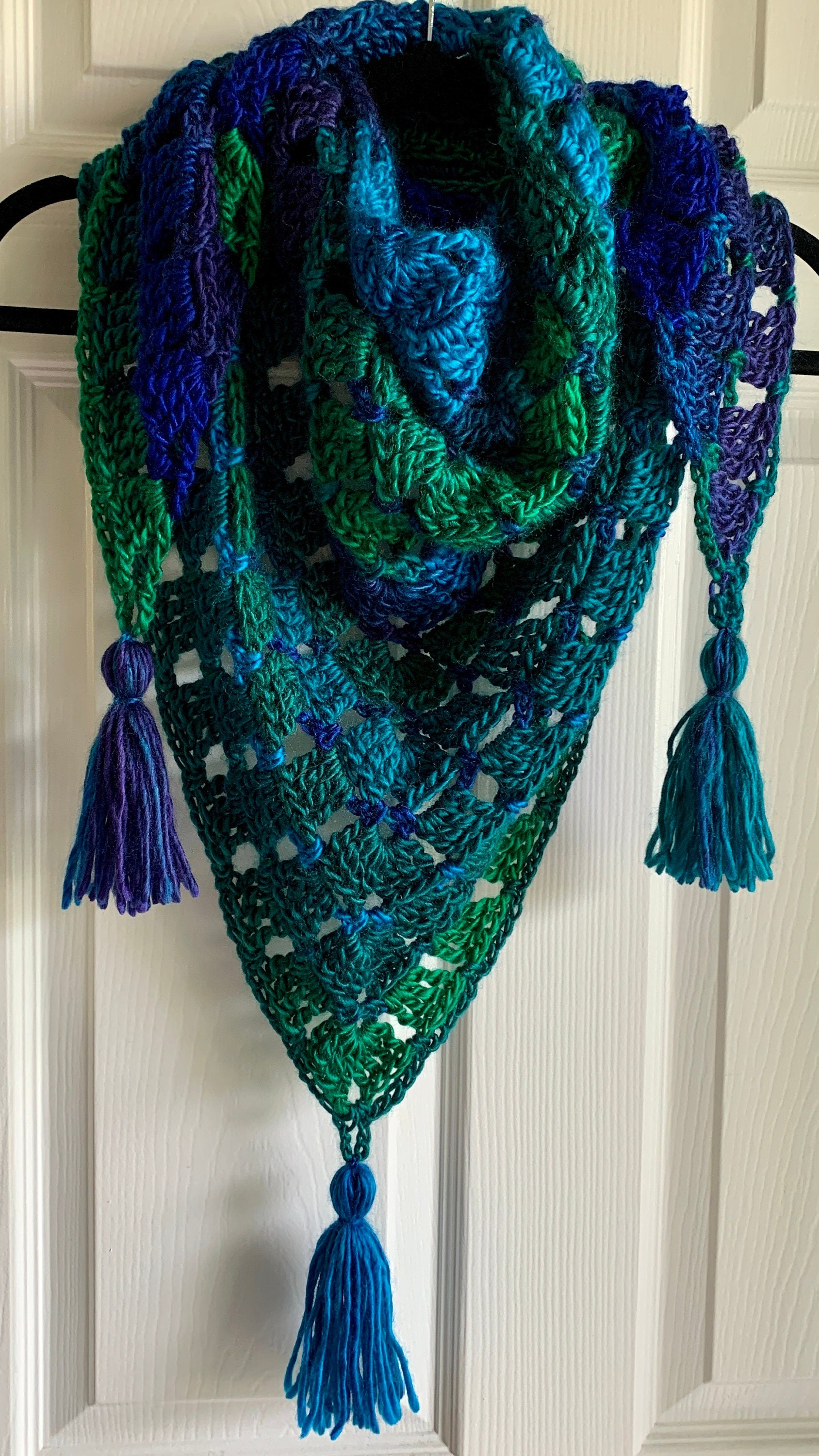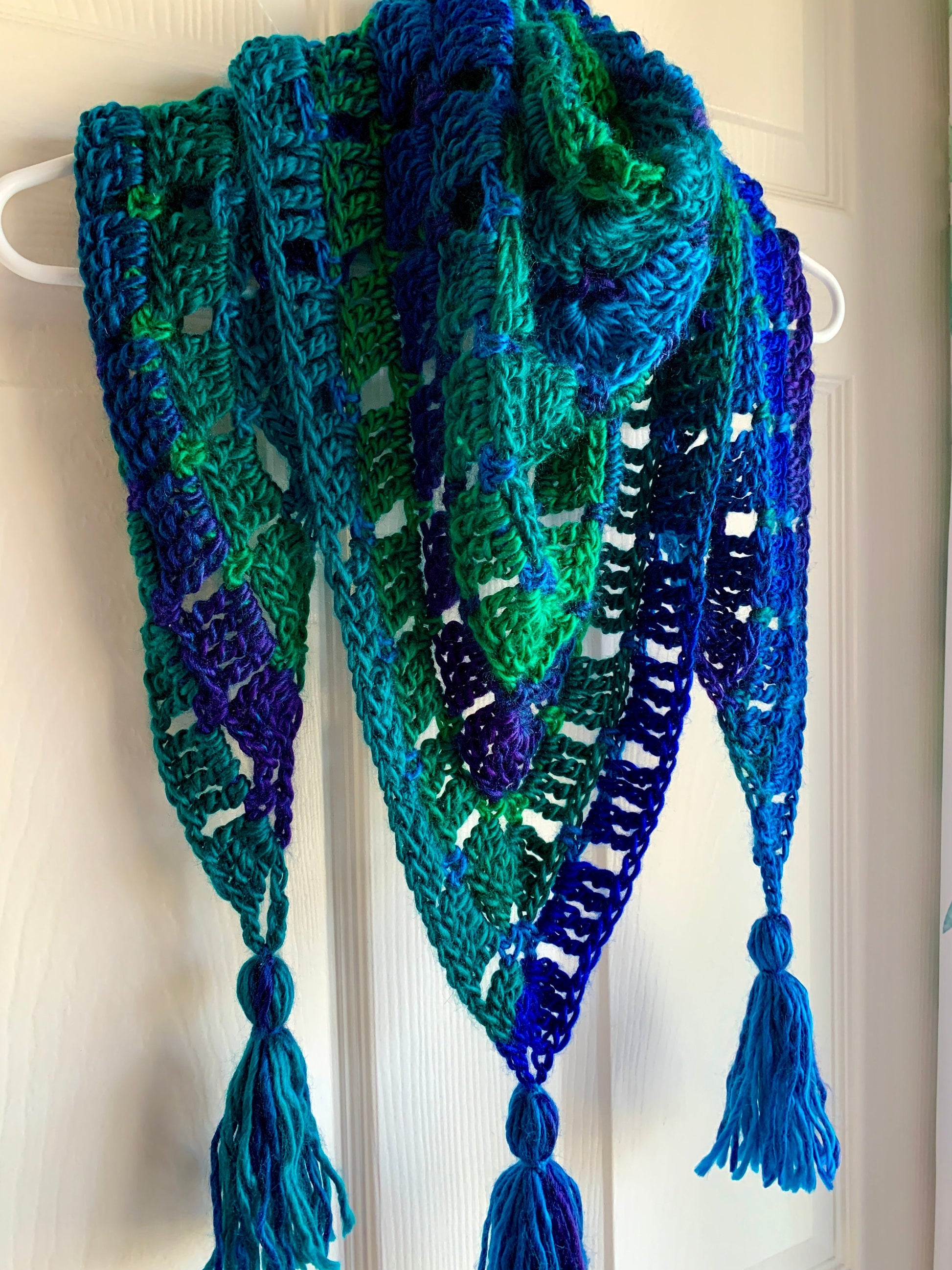 Our handmade crochet wrap is an artful blend of softness and style. Shades of Green, blue, purple, and teal mix together in this delicate and drapey wrap that's perfect for any season. Wrap it around your neck for a sophisticated scarf look or use it as a shawl to add a splash of color to your outfit. Each one is unique, with subtle variations due to its handmade nature. Crafted with care using only the finest materials, this wrap is sure to be your favorite go-to accessory.