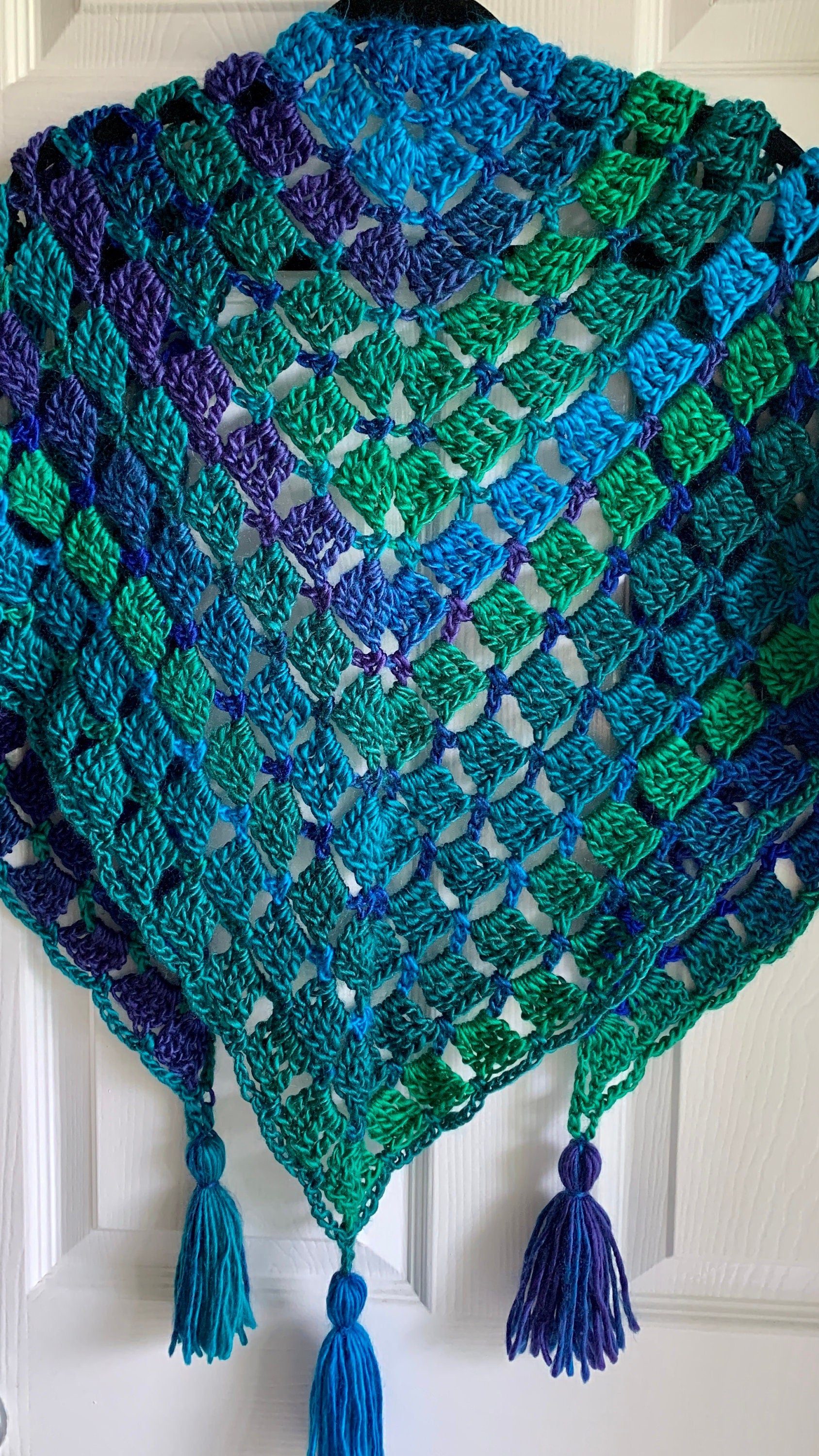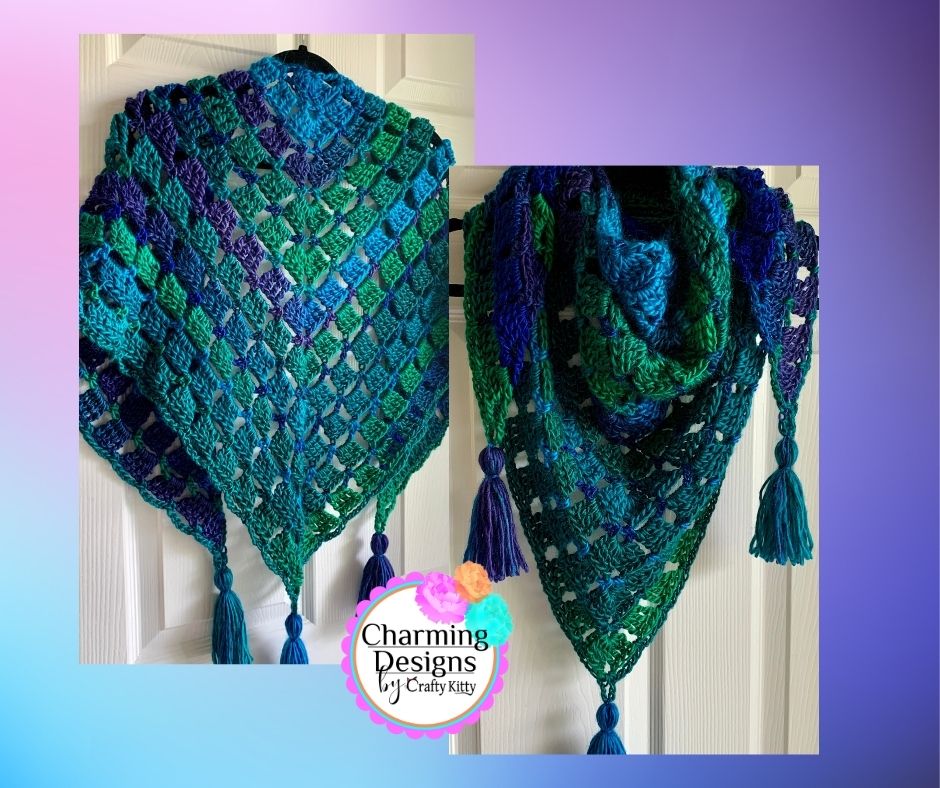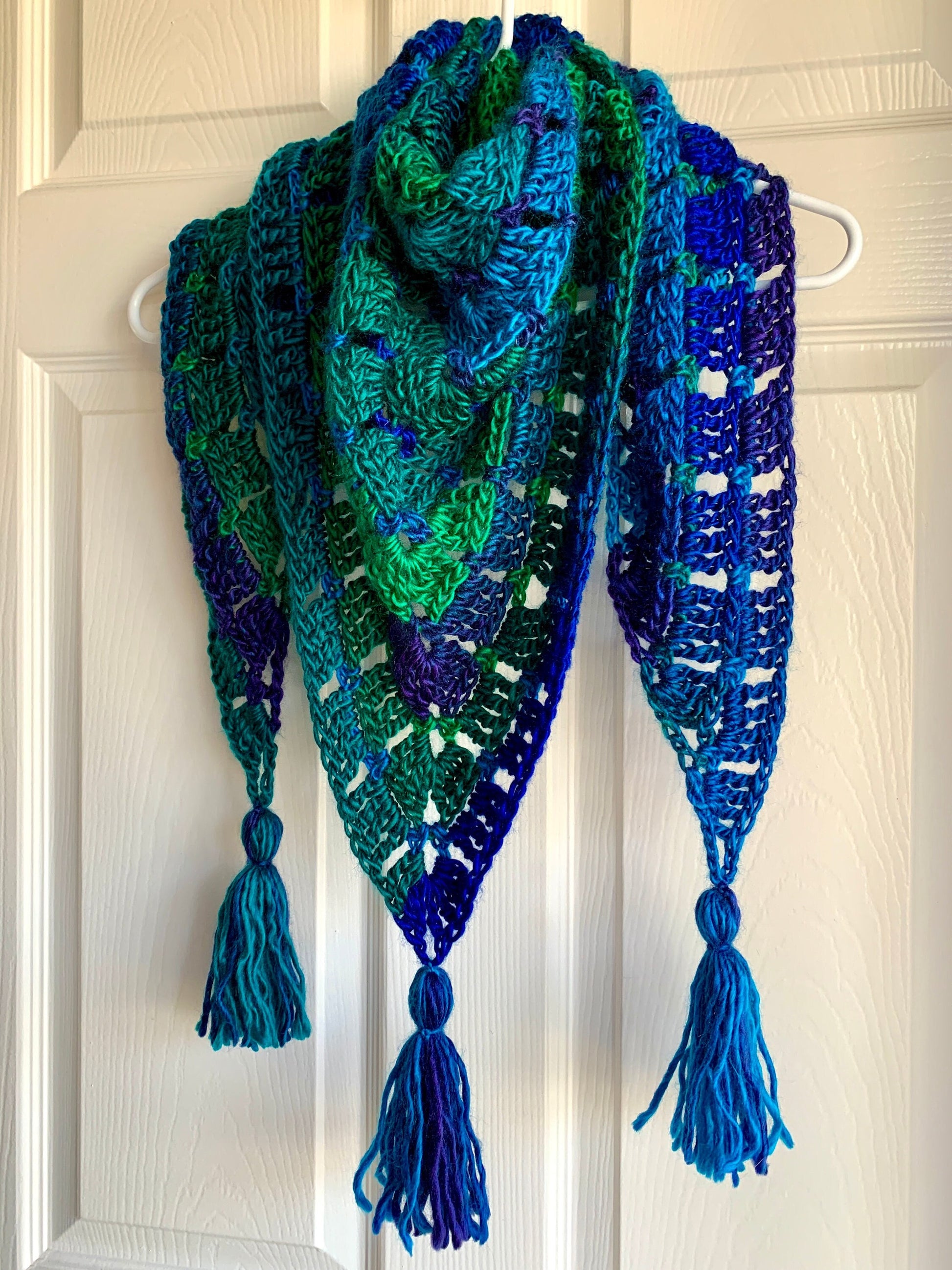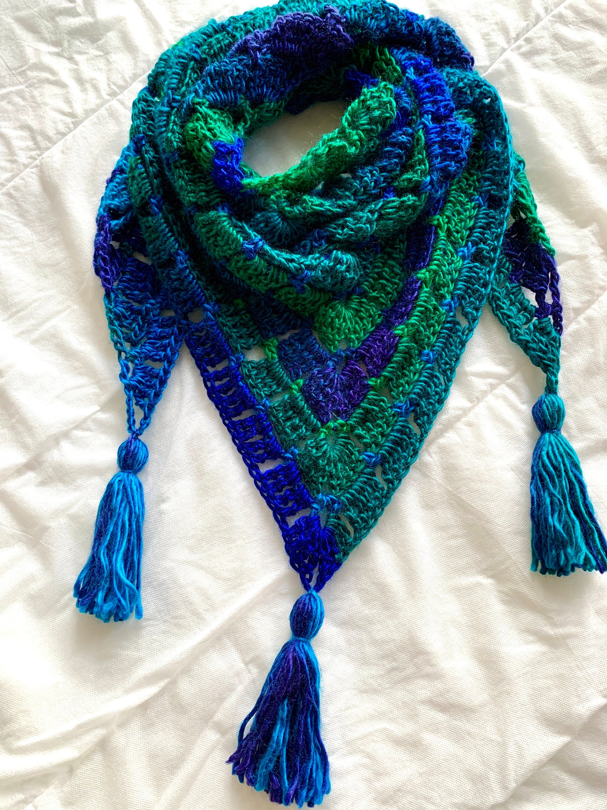 Our handmade crochet wrap is an artful blend of softness and style. Shades of Green, blue, purple, and teal mix together in this delicate and drapey wrap that's perfect for any season. Wrap it around your neck for a sophisticated scarf look or use it as a shawl to add a splash of color to your outfit. Each one is unique, with subtle variations due to its handmade nature. Crafted with care using only the finest materials, this wrap is sure to be your favorite go-to accessory.