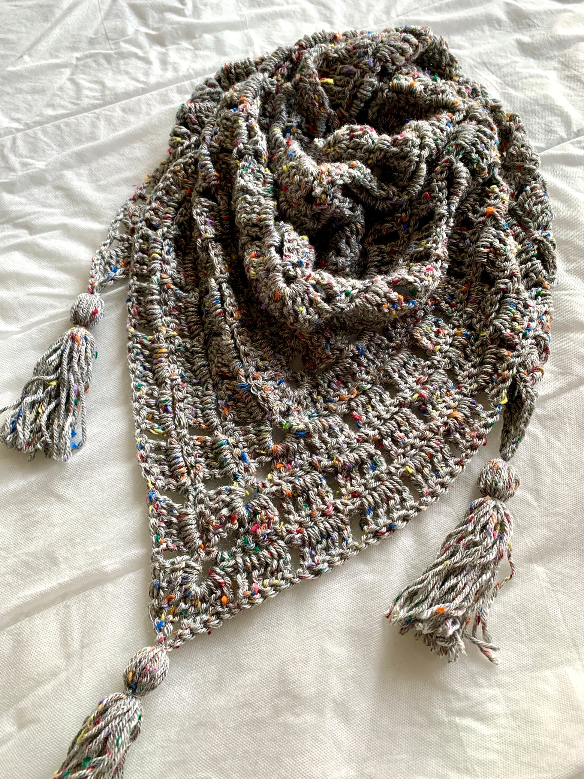 Made using Lion Brand Heartland Tweed in the colorway "Mount Rainier Tweed". Approximately 60" x 26". 94% acrylic / 6% rayon. Hand wash and lay flat to dry.